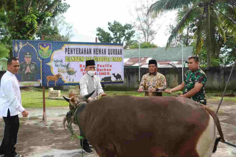 Selanjutnya melaksanakan penyerahan secara simbolis hewan Qurban berupa seekor sapi serta penyembelihan qurban oleh panitia dari Bintalrem 041/Gamas.