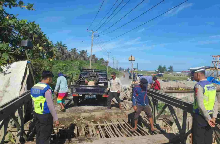 Perbaikan Jembatan Abrasi, Sat Lantas Polres Mukomuko dan Polsek Mukomuko Utara Tutup Arus Lalin