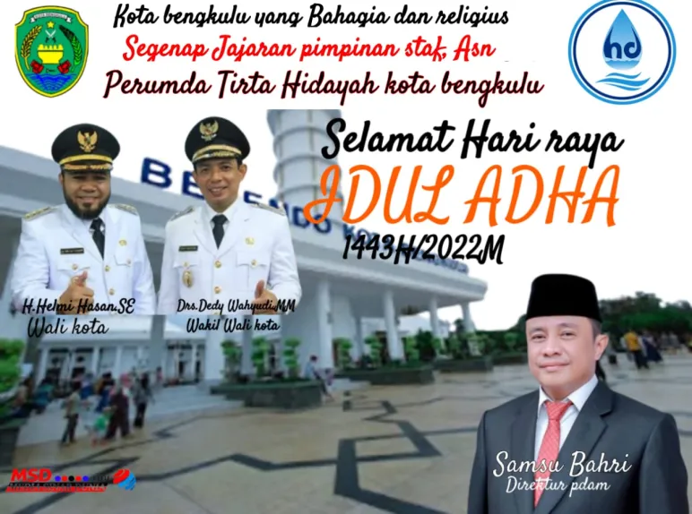 Banner PERUMDA TIRTA HIDAYAH KOTA BENGKULU MENGUCAPKAN SELAMAT HARI RAYA IDUL ADHA 1443H/2022 M 29 Jun 2022 11:08 Submitted by webadmin on 29 June 2022 Kota Bengkulu Berita Terkait Apr 20, 2026 Segenap Tenaga Medis dan Staf RSUD Kabupaten Mukomuko Mengucapkan Selamat Hari Kartini Feb 26, 2026 Kepala Dinas PUPR Mukomuko Mengucapkan Selamat Hari Jadi Kabupaten Mukomuko yang ke-23 Feb 25, 2026 Dinas pertanian kabupaten Mukomuko mengucapkan selamat hari jadi kabupaten Mukomuko ke - 23 Tahun 2026 Feb 24, 2026 Dinas pendidikan dan kebudayaan sekolah SD negeri 04 air Manjuto Kabupaten Mukomuko Mengucapkan Dirgahayu Kabupaten Mukomuko Ke - 23 Feb 18, 2026 Sekda Kabupaten Mukomuko Mengucapkan Selamat Hari Jadi Kabupaten Mukomuko yang Ke-23 Feb 17, 2026 Dinas Pendidikan dan Kebudayaan SDN 14 Penarik Kabupaten Mukomuko Mengucapkan Dirgahayu Kabupaten Mukomuko yang Ke-23