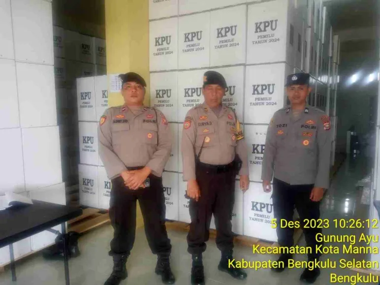 Bengkulu Selatan, Mediasinardunia.Com - Dalam rangka menciptakan situasi Kamtibmas yang Kondusif guna mendukung kelancaran dan keamanan pelaksanaan Pemilu serentak tahun 2024,dalam tahapan Kampanye, personel Polres Bengkulu Selatan Polda Bengkulu melalui Satgas Preventif OMB Nala 2023-2024, dipimpin Iptu Surya Darma dan Aiptu Turman Aidi S.H., bersama 4 personelnya melaksanakan patroli ke Kantor Komisi Pemilihan Umum (KPU) dan Gudang logistik KPU serta kantor Badan Pengawas Pemilu (bawaslu) di Kabupaten Bengkulu Selatan, Selasa (05/12/23)