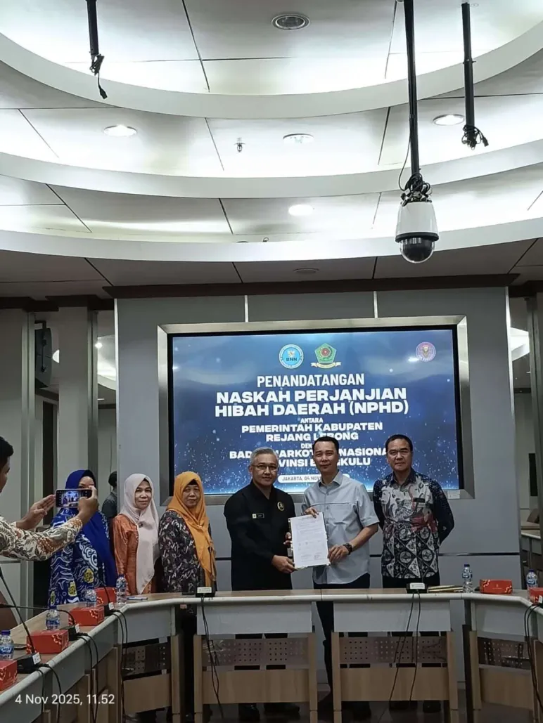 Jakarta, Mediasinardunia.com - Kabupaten Rejang Lebong dalam waktu dekat akan memiliki Kantor Badan Narkotika Nasional Kabupaten (BNNK). Hal ini ditandai dengan penandatanganan Naskah Perjanjian Hibah Daerah (NPHD) antara Pemerintah Kabupaten Rejang Lebong dan Badan Narkotika Nasional Provinsi (BNNP) Bengkulu, pada Selasa (4 November 2025) di Gedung Lemhannas, Jakarta.