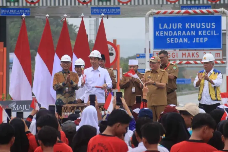 Bengkulu, Mediasinardunia.com - Presiden Joko Widodo didampingi Ibu Negara Iriana Jokowi, menteri PUPR Basuki Hadimuljono, Gubernur Bengkulu Rohidin Mersyah dan Wakil Gubernur Rosjonsyah meresmikan Tol Bengkulu - Taba Penanjung yang merupakan bagian dari ruas tol Bengkulu - Lubuk Linggau. Peresmian ditandai dengan penabuhan Raja Dol, alat musik khas Bengkulu, Kamis (20/7)