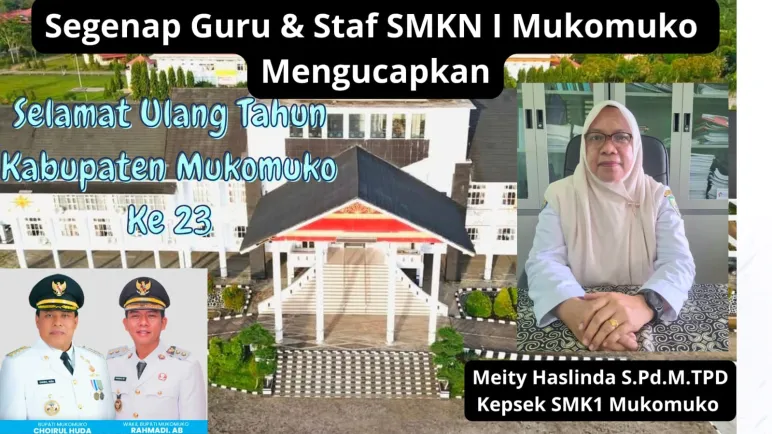 Segenap Guru Beserta Staf SMKN 1 Mukomuko Mengucapkan Selamat Ulang Tahun Kabupaten Mukomuko yang Ke-23 (Alfian T/Mediasinardunia.com) Banner Segenap Guru Beserta Staf SMKN 1 Mukomuko Mengucapkan Selamat Ulang Tahun Kabupaten Mukomuko yang Ke-23 17 Feb 2026 05:26 Submitted by webadmin on 17 February 2026 Mukomuko SMKN 1 Mukomuko HUT Mukomuko Ke-23 Mukomuko Berita Terkait Feb 26, 2026 Kepala Dinas PUPR Mukomuko Mengucapkan Selamat Hari Jadi Kabupaten Mukomuko yang ke-23 Feb 25, 2026 Dinas pertanian kabupaten Mukomuko mengucapkan selamat hari jadi kabupaten Mukomuko ke - 23 Tahun 2026 Feb 24, 2026 Dinas pendidikan dan kebudayaan sekolah SD negeri 04 air Manjuto Kabupaten Mukomuko Mengucapkan Dirgahayu Kabupaten Mukomuko Ke - 23 Feb 18, 2026 Sekda Kabupaten Mukomuko Mengucapkan Selamat Hari Jadi Kabupaten Mukomuko yang Ke-23 Feb 17, 2026 Dinas Pendidikan dan Kebudayaan SDN 14 Penarik Kabupaten Mukomuko Mengucapkan Dirgahayu Kabupaten Mukomuko yang Ke-23 Feb 17, 2026 Kepala Madrasah MTSN 2 Mukomuko Mengucapkan Dirgahayu Kabupaten Mukomuko yang Ke-23