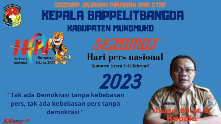 Banner Segenap Jajaran Pimpinan dan Staf, Bappelitbangda Kab, Mukomuko, Mengucapkan Selamat Hari pers nasional (HPN) yang di Selenggarakan 7-12 Februari 2023 di Medan Sumatra Utara. 8 Feb 2023 05:45 Submitted by webadmin on 8 February 2023 Mukomuko Berita Terkait Apr 20, 2026 Segenap Tenaga Medis dan Staf RSUD Kabupaten Mukomuko Mengucapkan Selamat Hari Kartini Feb 26, 2026 Kepala Dinas PUPR Mukomuko Mengucapkan Selamat Hari Jadi Kabupaten Mukomuko yang ke-23 Feb 25, 2026 Dinas pertanian kabupaten Mukomuko mengucapkan selamat hari jadi kabupaten Mukomuko ke - 23 Tahun 2026 Feb 24, 2026 Dinas pendidikan dan kebudayaan sekolah SD negeri 04 air Manjuto Kabupaten Mukomuko Mengucapkan Dirgahayu Kabupaten Mukomuko Ke - 23 Feb 18, 2026 Sekda Kabupaten Mukomuko Mengucapkan Selamat Hari Jadi Kabupaten Mukomuko yang Ke-23 Feb 17, 2026 Dinas Pendidikan dan Kebudayaan SDN 14 Penarik Kabupaten Mukomuko Mengucapkan Dirgahayu Kabupaten Mukomuko yang Ke-23