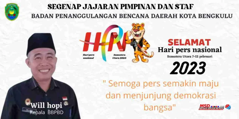 Banner Segenap Jajaran Pimpinan dan Staf BPBD Kota Bengkulu, Mengucapkan Selamat Hari pers nasional (HPN) yang di Selenggarakan 7-12 Februari 2023 di Medan Sumatra Utara. 4 Feb 2023 07:16 Submitted by webadmin on 4 February 2023 Kota Bengkulu Berita Terkait Apr 20, 2026 Segenap Tenaga Medis dan Staf RSUD Kabupaten Mukomuko Mengucapkan Selamat Hari Kartini Feb 26, 2026 Kepala Dinas PUPR Mukomuko Mengucapkan Selamat Hari Jadi Kabupaten Mukomuko yang ke-23 Feb 25, 2026 Dinas pertanian kabupaten Mukomuko mengucapkan selamat hari jadi kabupaten Mukomuko ke - 23 Tahun 2026 Feb 24, 2026 Dinas pendidikan dan kebudayaan sekolah SD negeri 04 air Manjuto Kabupaten Mukomuko Mengucapkan Dirgahayu Kabupaten Mukomuko Ke - 23 Feb 18, 2026 Sekda Kabupaten Mukomuko Mengucapkan Selamat Hari Jadi Kabupaten Mukomuko yang Ke-23 Feb 17, 2026 Dinas Pendidikan dan Kebudayaan SDN 14 Penarik Kabupaten Mukomuko Mengucapkan Dirgahayu Kabupaten Mukomuko yang Ke-23