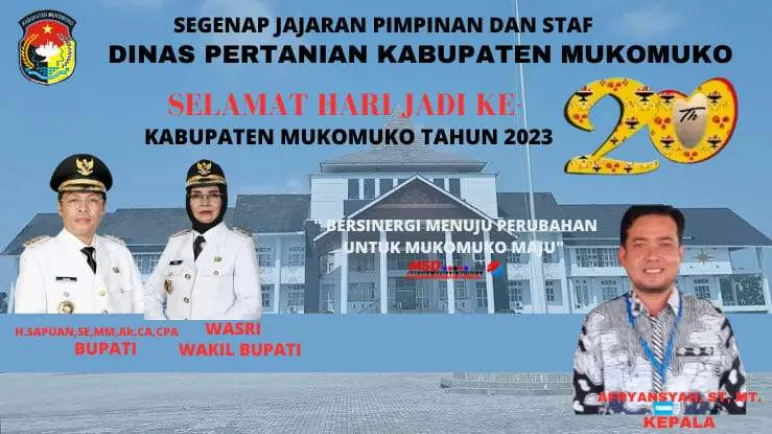 Mukomuko Segenap Jajaran Pimpinan dan Staf Dinas Pertanian Mengucapkan Selamat Hari Jadi Kabupaten Mukomuko Ke- 20 23 Feb 2023 04:11 Submitted by webadmin on 23 February 2023 Mukomuko Berita Terkait Apr 22, 2026 Winarno Sebut Bupati Instruksikan Pengisian Jabatan, 137 Pejabat Bakal Dilantik Akhir Bulan Ini Apr 18, 2026 Tolak PHK Sepihak, Bupati Mukomuko Minta Perselisihan Antara Perusahaan dan Pekerja Diselesaikan dengan Musyawarah Apr 17, 2026 Pemerintah Desa Tanjung Mulya kecamatan XIV Koto Salurkan BLT DD Tahap 1 Tahun 2026 Apr 15, 2026 Gelar Innovation Award 2026, Pemkab Mukomuko Dorong OPD Kreatif dan Inovatif Apr 14, 2026 Dipimpin Camat, Seluruh Perangkat Desa di XIV Koto Ajukan Pencairan APBDes Tahap II Serentak Apr 11, 2026 Pemkab Mukomuko Luncurkan Inisiatif Pengembangan Lanskap Berkelanjutan, Gabungkan Ekologi dan Ekonomi