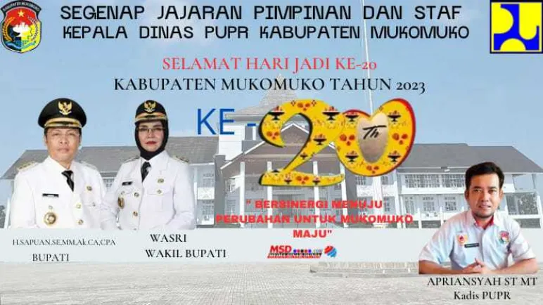 Mukomuko Segenap Jajaran Pimpinan dan Staf Dinas PUPR , Mengucapkan Selamat Hari Jadi Kabupaten Mukomuko Ke- 20 23 Feb 2023 04:25 Submitted by webadmin on 23 February 2023 Mukomuko Berita Terkait Apr 22, 2026 Winarno Sebut Bupati Instruksikan Pengisian Jabatan, 137 Pejabat Bakal Dilantik Akhir Bulan Ini Apr 18, 2026 Tolak PHK Sepihak, Bupati Mukomuko Minta Perselisihan Antara Perusahaan dan Pekerja Diselesaikan dengan Musyawarah Apr 17, 2026 Pemerintah Desa Tanjung Mulya kecamatan XIV Koto Salurkan BLT DD Tahap 1 Tahun 2026 Apr 15, 2026 Gelar Innovation Award 2026, Pemkab Mukomuko Dorong OPD Kreatif dan Inovatif Apr 14, 2026 Dipimpin Camat, Seluruh Perangkat Desa di XIV Koto Ajukan Pencairan APBDes Tahap II Serentak Apr 11, 2026 Pemkab Mukomuko Luncurkan Inisiatif Pengembangan Lanskap Berkelanjutan, Gabungkan Ekologi dan Ekonomi