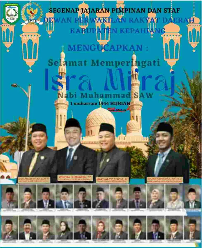 Segenap Jajaran Pimpinan dan Staf DPRD Kabupaten Kepahiang, Mengucapkan Selamat memperingati Isra DPRD Segenap Jajaran Pimpinan dan Staf DPRD Kabupaten Kepahiang, Mengucapkan Selamat memperingati Isra mi'raj Nabi Muhammad Saw 1 Muharam 1444 Hijriah 15 Feb 2023 11:26 Submitted by webadmin on 15 February 2023 Kapahiang Berita Terkait Apr 21, 2026 Ketua DPRD Bengkulu Selatan Ikuti Kursus Pemantapan Pimpinan Daerah di Magelang Apr 15, 2026 DPRD Bengkulu Utara Serahkan Rekomendasi LKPJ 2025 kepada Bupati Apr 13, 2026 DPRD Bengkulu Kritik Layanan Penerbangan, Garuda Indonesia Tak Lagi Beroperasi Apr 13, 2026 Reses DPRD Lebong, Masyarakat Minta Perbaikan Infrastruktur Rusak Akibat Banjir Mar 18, 2026 DPD Partai NasDem Kota Bengkulu Serahkan SK DPRT dan Bingkisan Lebaran Mar 14, 2026 DPRD Mukomuko Dorong Pemulihan Ekonomi, Fokus Pemberdayaan UMKM