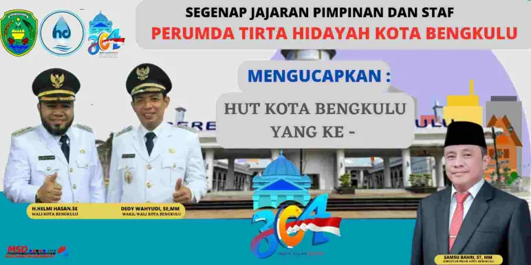 Banner SEGENAP JAJARAN PIMPINAN DAN STAF, PERUMDA TIRTA HIDAYAH KOTA BENGKUKU, MENGUCAPKAN HUT KOTA KE-304 3 Mar 2023 17:31 Submitted by webadmin on 3 March 2023 Kota Bengkulu Berita Terkait Feb 26, 2026 Kepala Dinas PUPR Mukomuko Mengucapkan Selamat Hari Jadi Kabupaten Mukomuko yang ke-23 Feb 25, 2026 Dinas pertanian kabupaten Mukomuko mengucapkan selamat hari jadi kabupaten Mukomuko ke - 23 Tahun 2026 Feb 24, 2026 Dinas pendidikan dan kebudayaan sekolah SD negeri 04 air Manjuto Kabupaten Mukomuko Mengucapkan Dirgahayu Kabupaten Mukomuko Ke - 23 Feb 18, 2026 Sekda Kabupaten Mukomuko Mengucapkan Selamat Hari Jadi Kabupaten Mukomuko yang Ke-23 Feb 17, 2026 Dinas Pendidikan dan Kebudayaan SDN 14 Penarik Kabupaten Mukomuko Mengucapkan Dirgahayu Kabupaten Mukomuko yang Ke-23 Feb 17, 2026 Kepala Madrasah MTSN 2 Mukomuko Mengucapkan Dirgahayu Kabupaten Mukomuko yang Ke-23