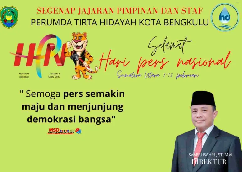 Banner Segenap Jajaran Pimpinan dan Staf, Perumda Tirta Hidayah Kota Bengkulu, Mengucapkan Selamat Hari pers nasional (HPN) yang di Selenggarakan 7-12 Februari 2023 di Medan Sumatra Utara. 4 Feb 2023 07:29 Submitted by webadmin on 4 February 2023 Kota Bengkulu Berita Terkait Apr 20, 2026 Segenap Tenaga Medis dan Staf RSUD Kabupaten Mukomuko Mengucapkan Selamat Hari Kartini Feb 26, 2026 Kepala Dinas PUPR Mukomuko Mengucapkan Selamat Hari Jadi Kabupaten Mukomuko yang ke-23 Feb 25, 2026 Dinas pertanian kabupaten Mukomuko mengucapkan selamat hari jadi kabupaten Mukomuko ke - 23 Tahun 2026 Feb 24, 2026 Dinas pendidikan dan kebudayaan sekolah SD negeri 04 air Manjuto Kabupaten Mukomuko Mengucapkan Dirgahayu Kabupaten Mukomuko Ke - 23 Feb 18, 2026 Sekda Kabupaten Mukomuko Mengucapkan Selamat Hari Jadi Kabupaten Mukomuko yang Ke-23 Feb 17, 2026 Dinas Pendidikan dan Kebudayaan SDN 14 Penarik Kabupaten Mukomuko Mengucapkan Dirgahayu Kabupaten Mukomuko yang Ke-23