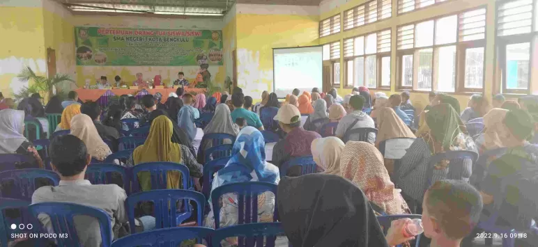 Kota Bengkulu -Mediasinardunia.com - Sekolah SMA N 1 Kota Bengkulu, adakan kegiatan Rapat pertemuan orang tua siswa/siswi dalam rangka meningkatkan kwalitas pengelolaan pelayanan mutu dalam pembelajaran untuk memenuhi delapan (8) standar Nasional pendidikan, bersama para guru beserta orang tua siswa/ siswi juga ketua komite yang berlangsung diaula sma.n 1 kota Bengkulu, Jum'at (16/09/2022).