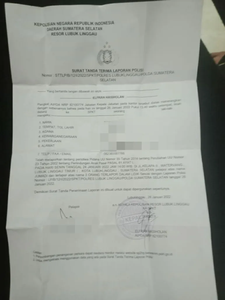 Lubuklinggau, “Mediasinardunia.com”- JD (41) warga Kota Lubuklinggau masih berharap laporannya di Polres Lubuklinggau 26 Januari 2022 yang lalu, dapat segera mengungkap dugaan tindak pidana yang menimpa anaknya AG (15) yang masih duduk dibangku SMA kelas 1, sesuai dengan Undang-undang Nomor 35 Tahun 2014 tentang perubahan Undang-undang Nomor 23 Tahun 2002 tentang perlindungan anak Pasal 81 Ayat 1.