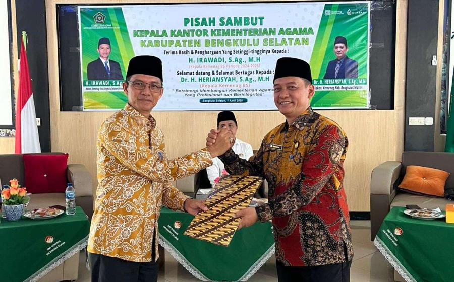 Pisah Sambut Kakan Kemenag Bengkulu Selatan, H. Irawadi Serahkan Jabatan kepada Dr. H. Heriansyah