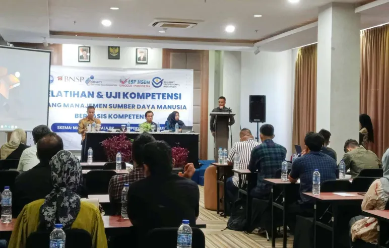 Bengkulu - Mediasinardunia.com - Lembaga Pelatihan Kerja (LPK) PT Sahabat Profesional Indonesia selaku Tempat Ujian Kompetensi (TUK) Lembaga Sertifikasi Profesi Manajemen Sumber Daya Manusia Unggul Indonesia (LSP MSDM UI) dari Badan Nasional Sertifikasi Profesi (BNSP) bekerjasama dengan Dinas Ketenagakerjaan dan Transmigrasi (Disnakertrans) Provinsi Bengkulu menggelar Pelatihan dan Uji Kompetensi gelombang satu 2023 terhadap 52 HRD, di salah satu hotel di Kota Bengkulu, Sabtu (8/7/23).