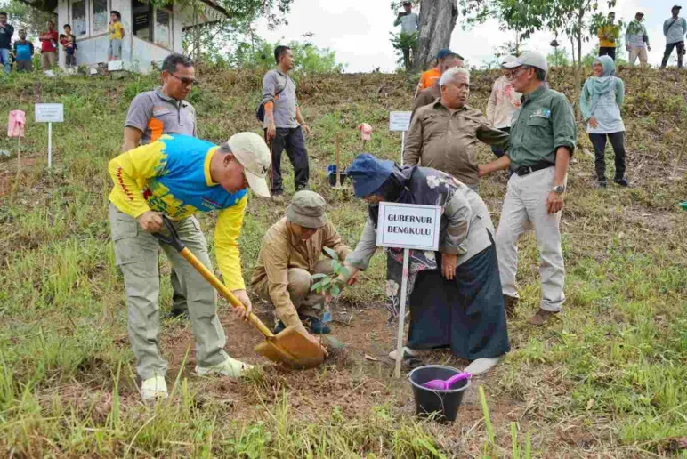 Bengkulu, Mediasinardunia.Com - Jelang tutup tahun 2023, Gubernur Rohidin Mersyah bersama Staf Ahli Kementerian Lingkungan Hidup dan Kehutanan, Forkopimda, ASN, pihak Akademisi serta pemerhati dan pecinta lingkungan tanam ratusan pohon buah dan kayu di kawasan Taman Hutan Raya Rojo Lelo, Sabtu 30/12.