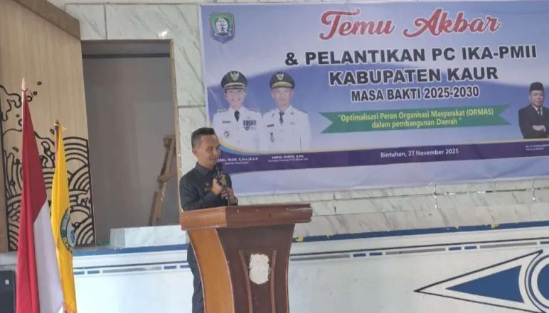Kaur, Mediasinardunia.com - Wakil Bupati Kaur, Abdul Hamid, S.Pd.I, secara resmi melantik Pengurus Cabang Ikatan Keluarga Pergerakan Mahasiswa Islam Indonesia (IK PMII) Kabupaten Kaur masa bakti 2025-2030. Acara pelantikan berlangsung khidmat dan penuh kekeluargaan di gedung GSG Pemkab Kaur.